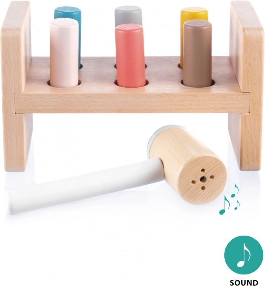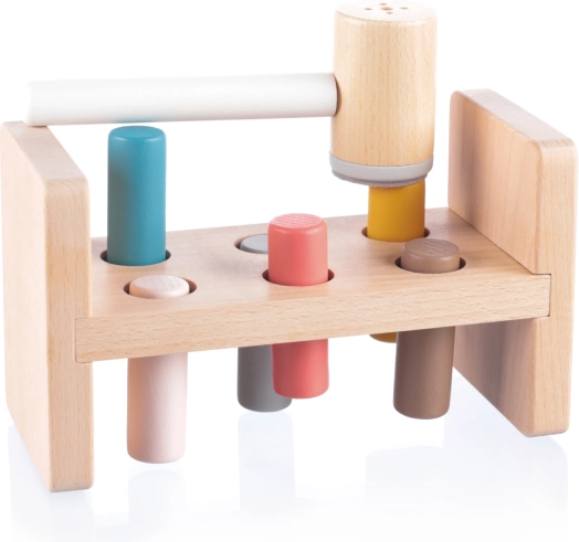 Træbankelegetøjet er designet specielt til små børn, som kan lege med det i timevis. Det består af et træbord med huller, seks farverige stifter og en hammer. Når en stift hamres ned i et hul, laver hammeren en behagelig lyd. Stifterne kan hammres ind fra begge sider af bordet, hvilket gør det sjovere.