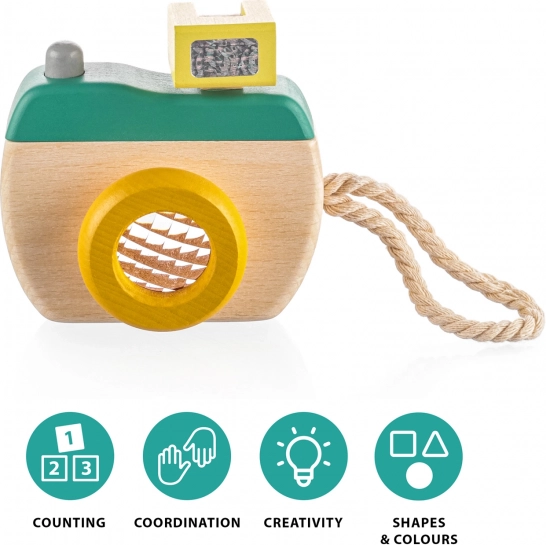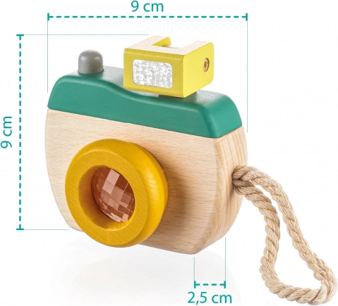Fremstillet af kvalitets træ er dette kamera let og kompakt, ideelt til små fotografer. For nem transport er det udstyret med en robust rem.