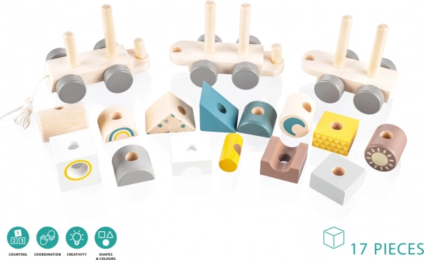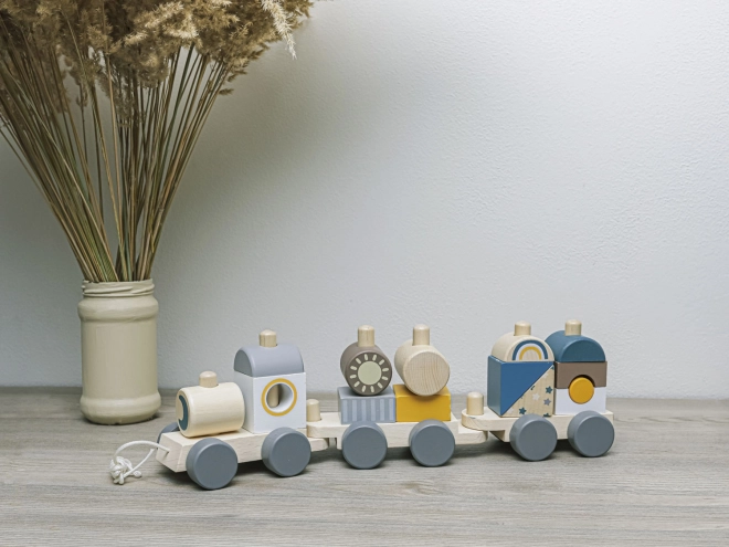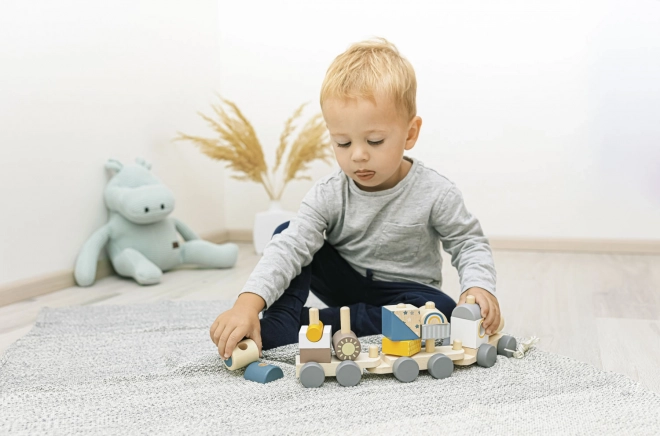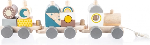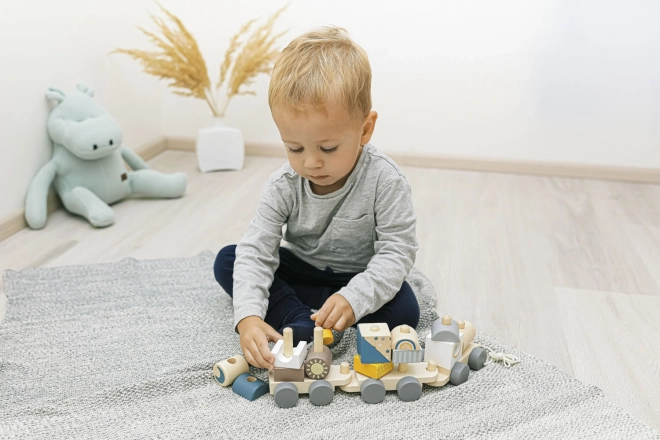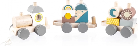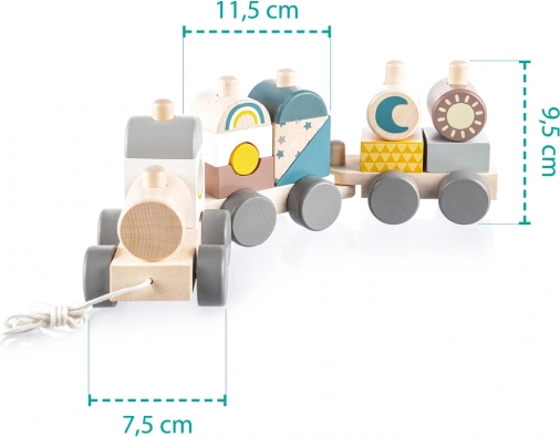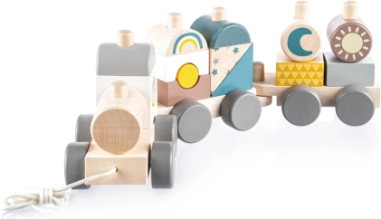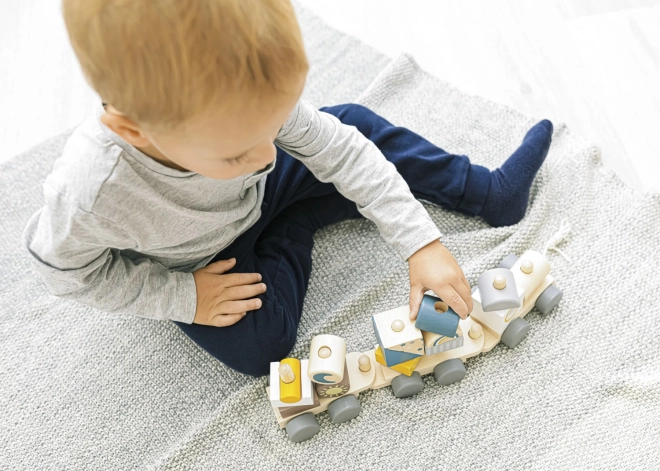 Farverigt trætog til børn, som understøtter deres motoriske færdigheder. Dette interaktive og lærende tog kan både bygges og trækkes, hvilket motiverer børn til at gå og udvikler deres kreativitet.