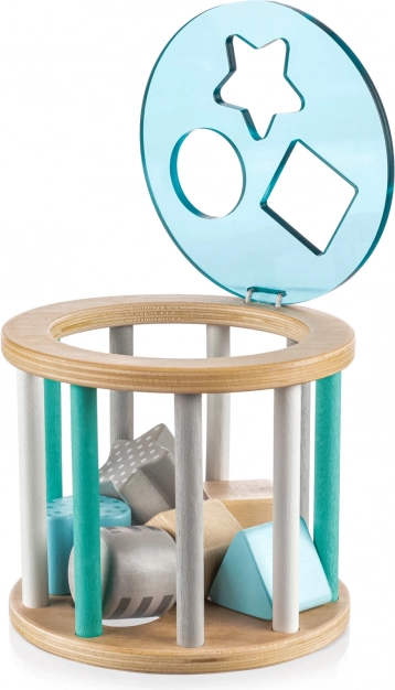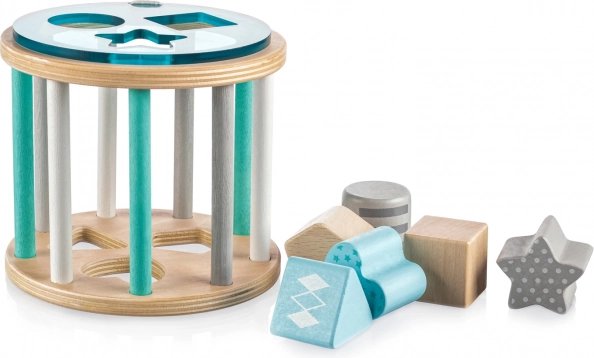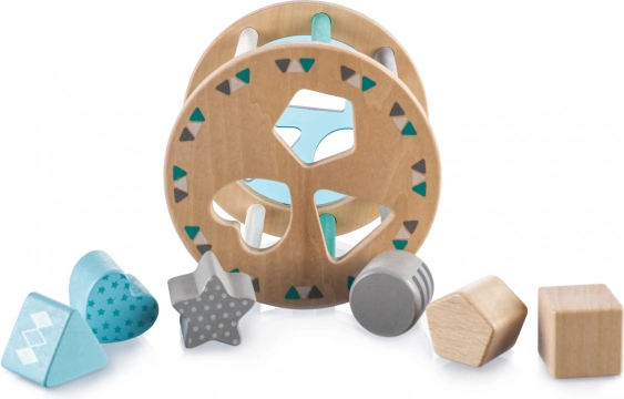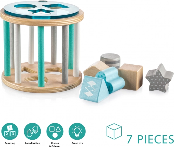 Det træ-aktive indsætningslegetøj tilbyder børn en interaktiv måde at lære at genkende former og farver på. Legetøjet er lavet af kvalitetsnaturtræ og bruger vandbaserede farver, hvilket sikrer sikkerhed for børn. Indsætningslegetøjet består af en cylinder med flere åbninger, hvor klodser i forskellige former og farver indsættes.