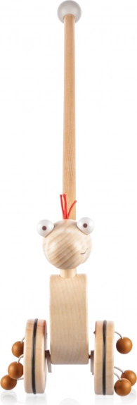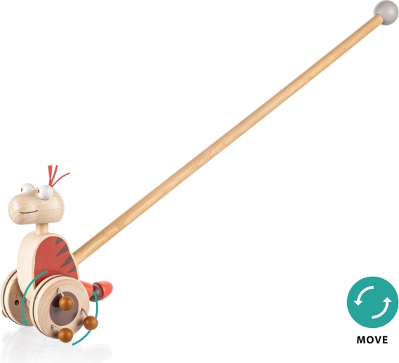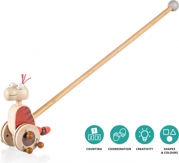 Legetøjet er ikke kun sjovt, men også praktisk. Den robuste træstang på 48 cm fungerer som støtte ved de første skridt, og legetøjet har ingen skarpe kanter, hvilket sikrer sikker leg. Det er lavet af kvalitets- og holdbart træ, som sikrer lang levetid. En fantastisk ledsager til leg derhjemme og på gåture udendørs.