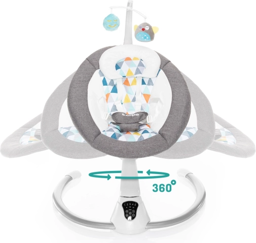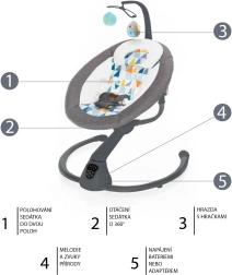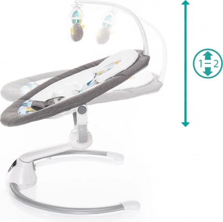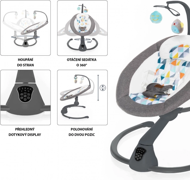 Det intuitive touchpanel og den medfølgende fjernbetjening gør det nemt at indstille vuggeintensiteten (5 niveauer), vuggetid (8/15/30 min) samt lydstyrken på melodierne. Automatisk start af vugning ved registrering af barnets bevægelse giver ro selv i mere krævende øjeblikke. Den bløde polstring, 5-punkts sikkerhedssele og legetøjsbøjlen med to aftagelige plysdyr sørger for sikkerhed og glæde.