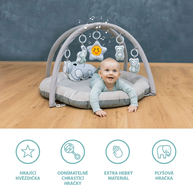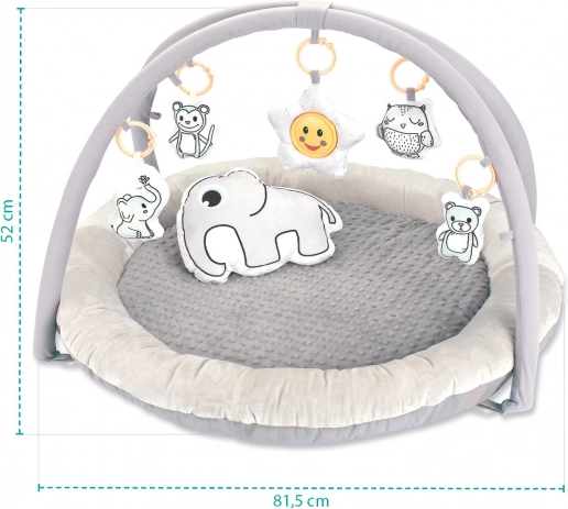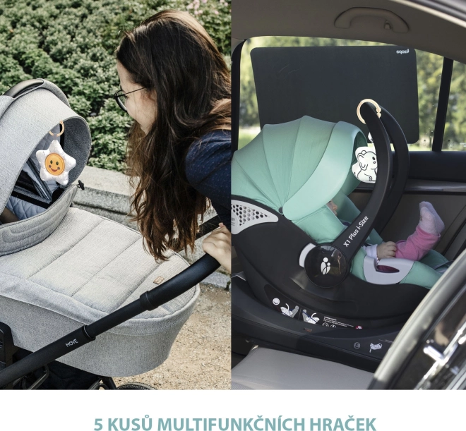 Medfølgende er en bue med interaktive plysdyr med raslelyde, som motiverer babyen til aktiv bevægelse, styrker finmotorikken og understøtter den naturlige udvikling. Legetøjet kan nemt klikkes af og bruges på farten – på bilstolen eller barnevognen.