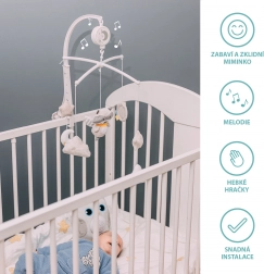 Musikuro Elefant er ideel til børneværelset som en smuk dekoration og en hjælp til at falde i søvn. Den indeholder plyslegetøj i bløde farver og flere søde melodier, der understøtter barnets auditive, motoriske og visuelle sanser. I sengen skabes en behagelig atmosfære, og barnet beroliges for nem indslumring.