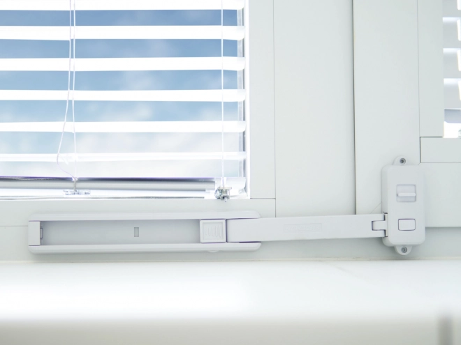 Pålidelig sikring af vinduer og skydedøre med vores hvide låsemekanisme. Produktet er designet til at forhindre utilsigtet åbning og beskytte dine børn mod ulykker:
