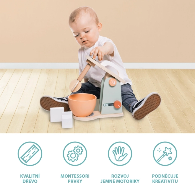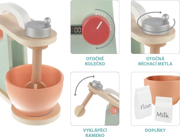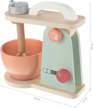 En gennemarbejdet mixer til alle børn, der vil bage de bedste kager. Mixeren har flere knapper, som kan drejes eller trykkes ned. Der medfølger en skål, hvor køkkenmaskinen blander dejen. Legetøjet er lavet af kvalitets træ og vandbaserede farver.