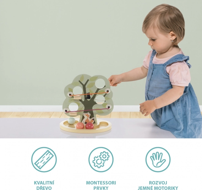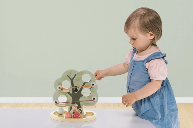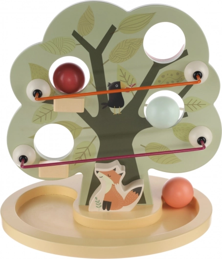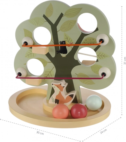 Den søde trælegetøj i form af et træ har flere huller til at stikke kugler igennem. Renden i bunden fanger kuglerne, så barnet kan se, hvordan de falder. Legetøjet udvikler fantasi, tænkning og håndkoordination.