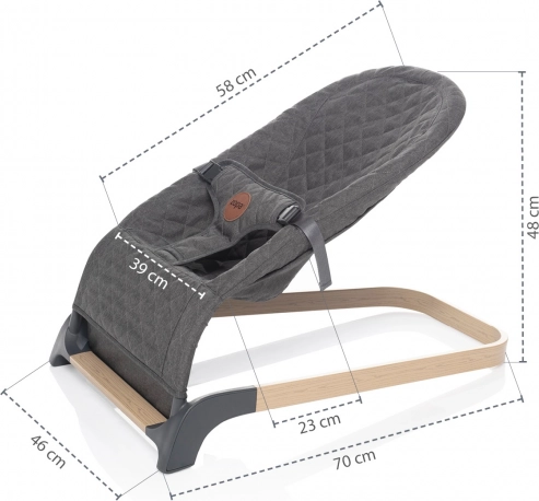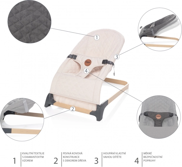 Babybouncer Miura lader barnet være i centrum, mens forældrene kan tage sig af pligter eller underholdning. De bløde seler sikrer maksimal sikkerhed for barnet i vuggen, mens det hviler eller leger. Det faste stof med diamantmønster giver komfort og samtidig tilstrækkelig støtte.