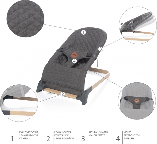 Lehestolen Miura lader barnet være i centrum for begivenhederne, mens forældrene kan tage sig af pligter eller underholdning. Bløde seler sikrer maksimal sikkerhed for barnet i lehestolen, mens det hviler eller leger. Det stærke stof med diamantmønster giver komfort og samtidig tilstrækkelig støtte.