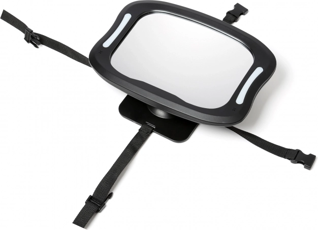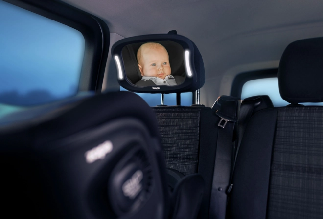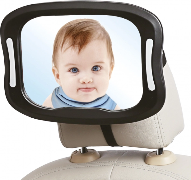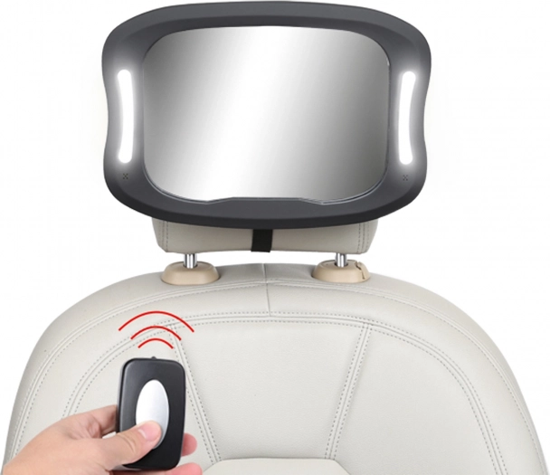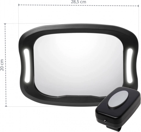Hold øje med barnet under kørslen – også i mørke. Det praktiske spejl med LED-belysning gør det muligt at se barnet selv under dårlige lysforhold. Spejlet er slagfast og let at montere på sædernes nakkestøtter. Det har lang batterilevetid og kan betjenes med fjernbetjening (spejl 3× AA, fjernbetjening – 2× AAA). Batterier medfølger ikke.