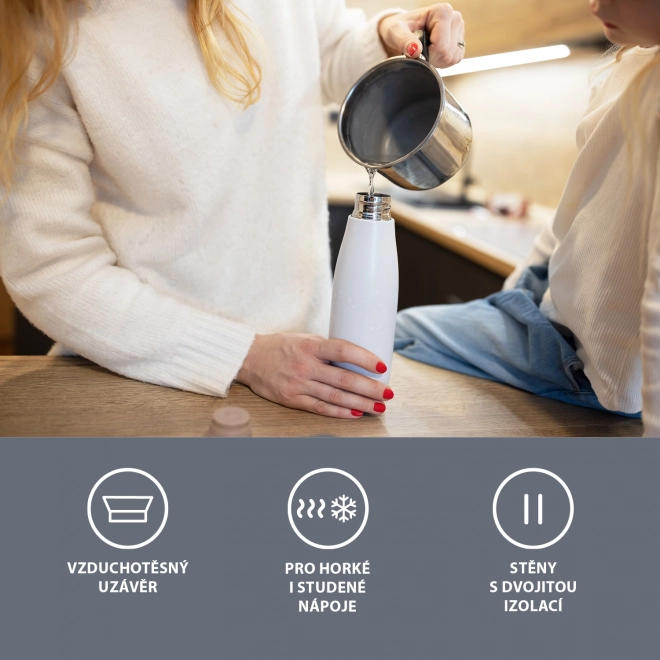 En kvalitets termoflaske til væsker med en kapacitet på 480 ml holder varme drikke varme i op til 12 timer og kolde drikke kolde i op til 24 timer. Den er lavet af højkvalitets rustfrit stål, som er modstandsdygtigt over for korrosion. Et tætsluttende låg sikrer, at termoflasken ikke lækker. Takket være vakuumisoleringen bliver ydersiden ikke varm, når flasken fyldes med varm væske. For et behageligt greb er termoflasken udstyret med en holder.