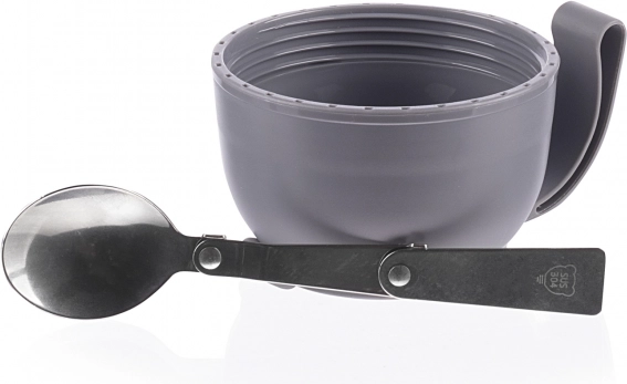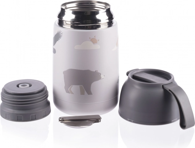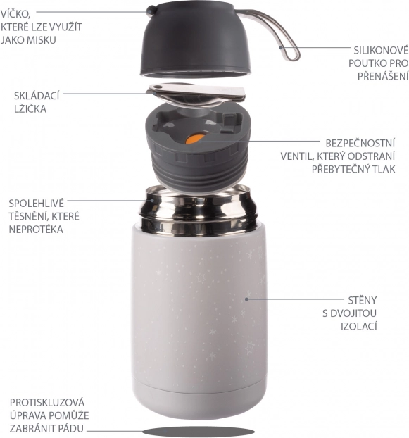 Der medfølger en smart sammenklappelig ske, som passer perfekt i låget, så du kan nyde varm grød eller suppe hvor som helst. Låget på termokanden kan bruges som kop eller skål. Det øverste låg er udstyret med en sikkerhedsventil, der frigiver overskydende luft, som danner tryk. Ved at frigive den komprimerede luft kan beholderen nemt åbnes, og man undgår eventuelle skoldninger fra damp.