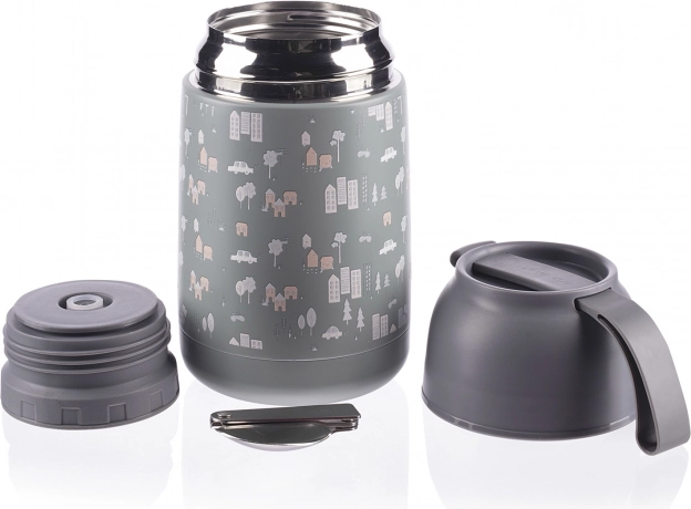 Der medfølger en smart sammenklappelig ske, der passer perfekt i låget, så du kan nyde varm grød eller suppe hvor som helst. Termosens låg kan bruges som kop eller skål. Det øverste låg er udstyret med en sikkerhedsventil, som frigiver overskydende luft, der skaber tryk. Ved at frigive den komprimerede luft kan beholderen let åbnes, og man undgår eventuelle skoldninger fra damp.
