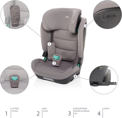 Ved en frontal kollision er autostolen udstyret med SP PAD, som reducerer belastningen på hoved, nakke og brystkasse. Belt Lock-funktionen tilføjer et fjerde punkt ved fastspænding og reducerer dermed trykket på barnets mave ved frontalt sammenstød. Den integrerede sidebeskyttelse SIP i hele længden beskytter barnet også i den nederste del. Overholdelse af den nyeste i-SIZE-standard garanterer sikkerhed gennem hele brugstiden.