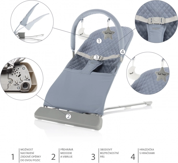 Behagelige vibrationer, 2 ryglænspositioner og komfortabel polstring i et moderne design, der passer ind i ethvert hjem, sikrer dit barn optimal afslapning. Tiden i vippestolen kan være både hvile og underholdning takket være legebøjlen med legetøj, som stimulerer babys sanser.
