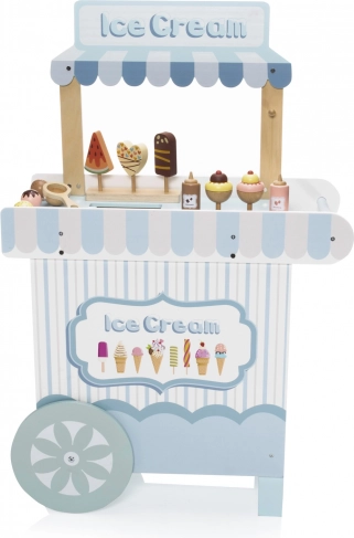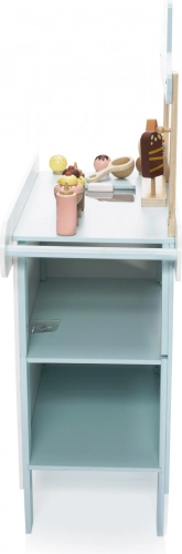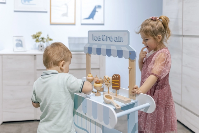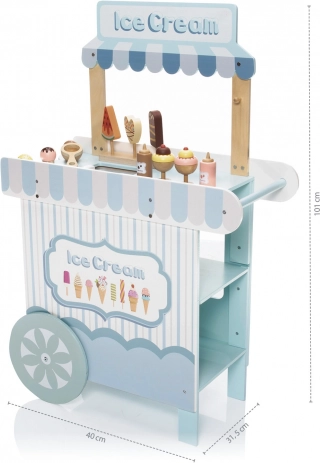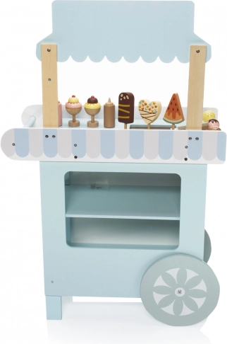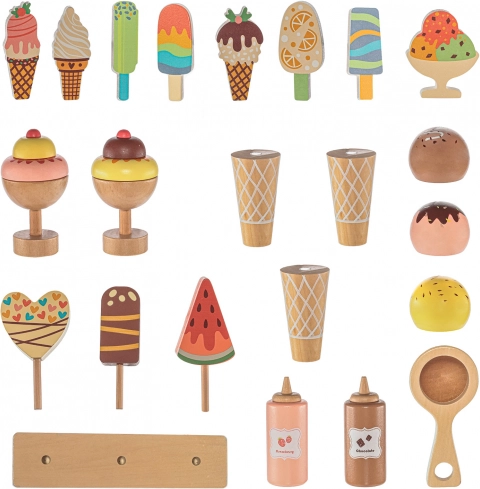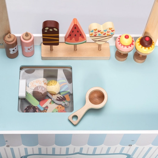 Den træbaserede, mobile isbod er et ideelt redskab til at udvikle børns fantasi og sociale færdigheder. Dette omhyggeligt designede sæt er udstyret med alt nødvendigt tilbehør, inklusive realistiske is-lækkerier og en lille fryser, så isen altid er frisk. Børn kan lege ishandlere og skabe lækre isdesserter.