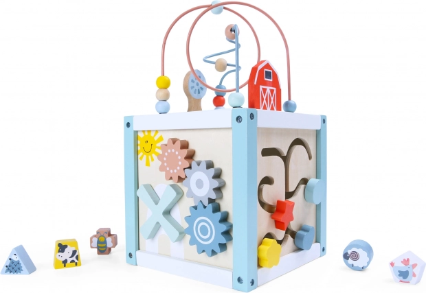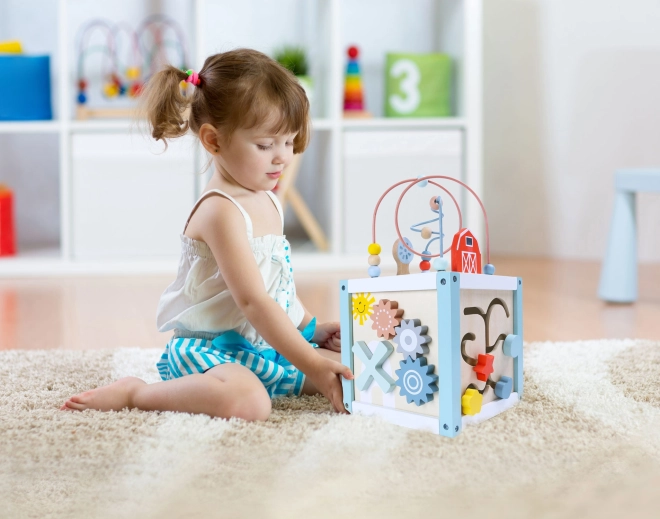Træ aktivitetskube til børn tilbyder mange forskellige måder at lege på. Støtter udviklingen af finmotorik og lærer børn former, farver og tal.