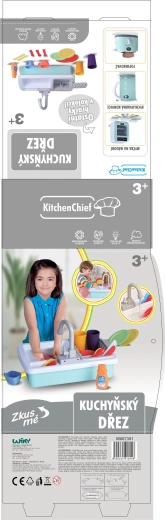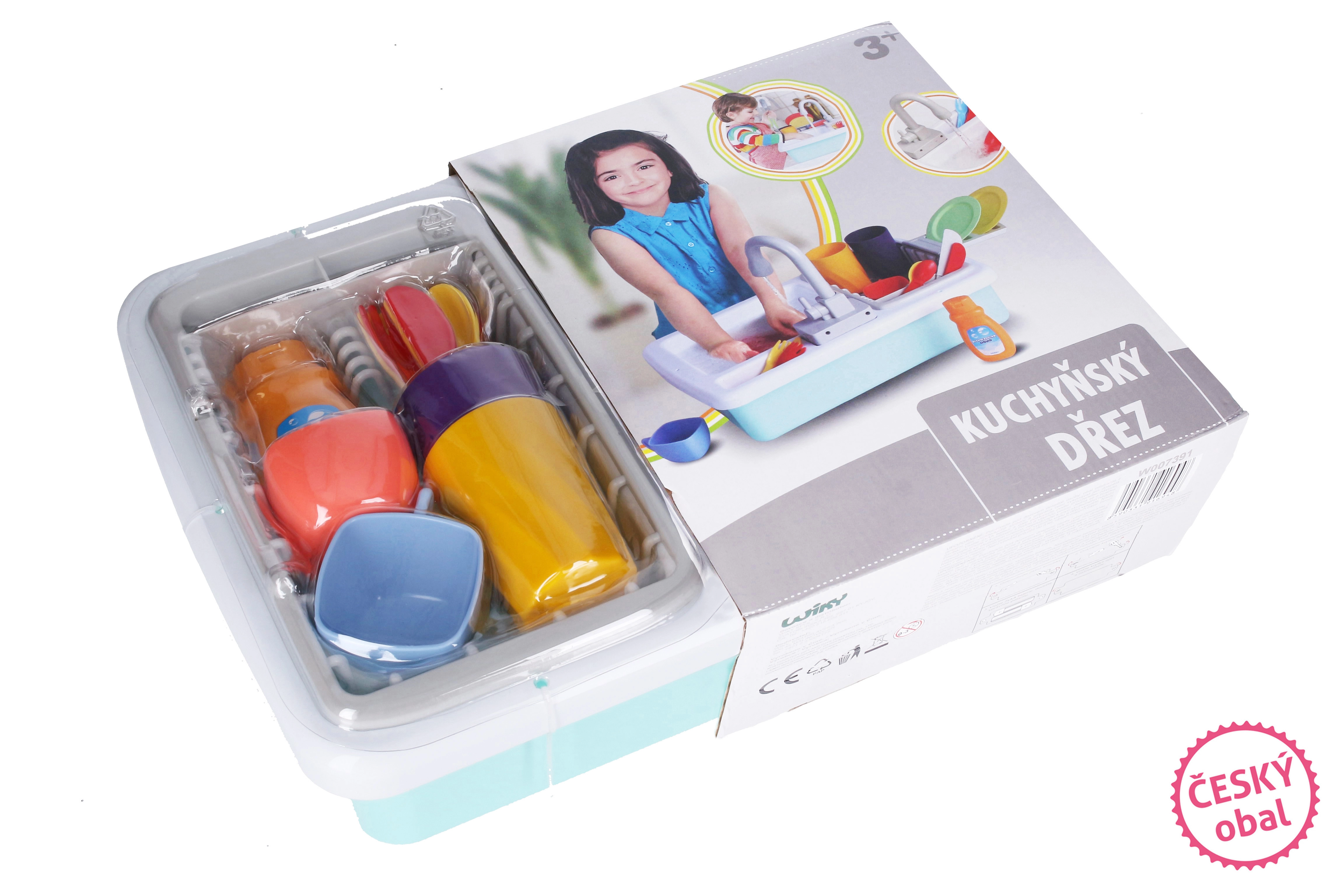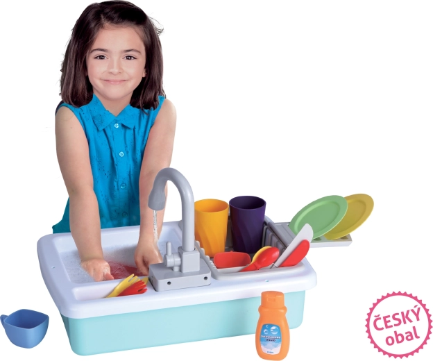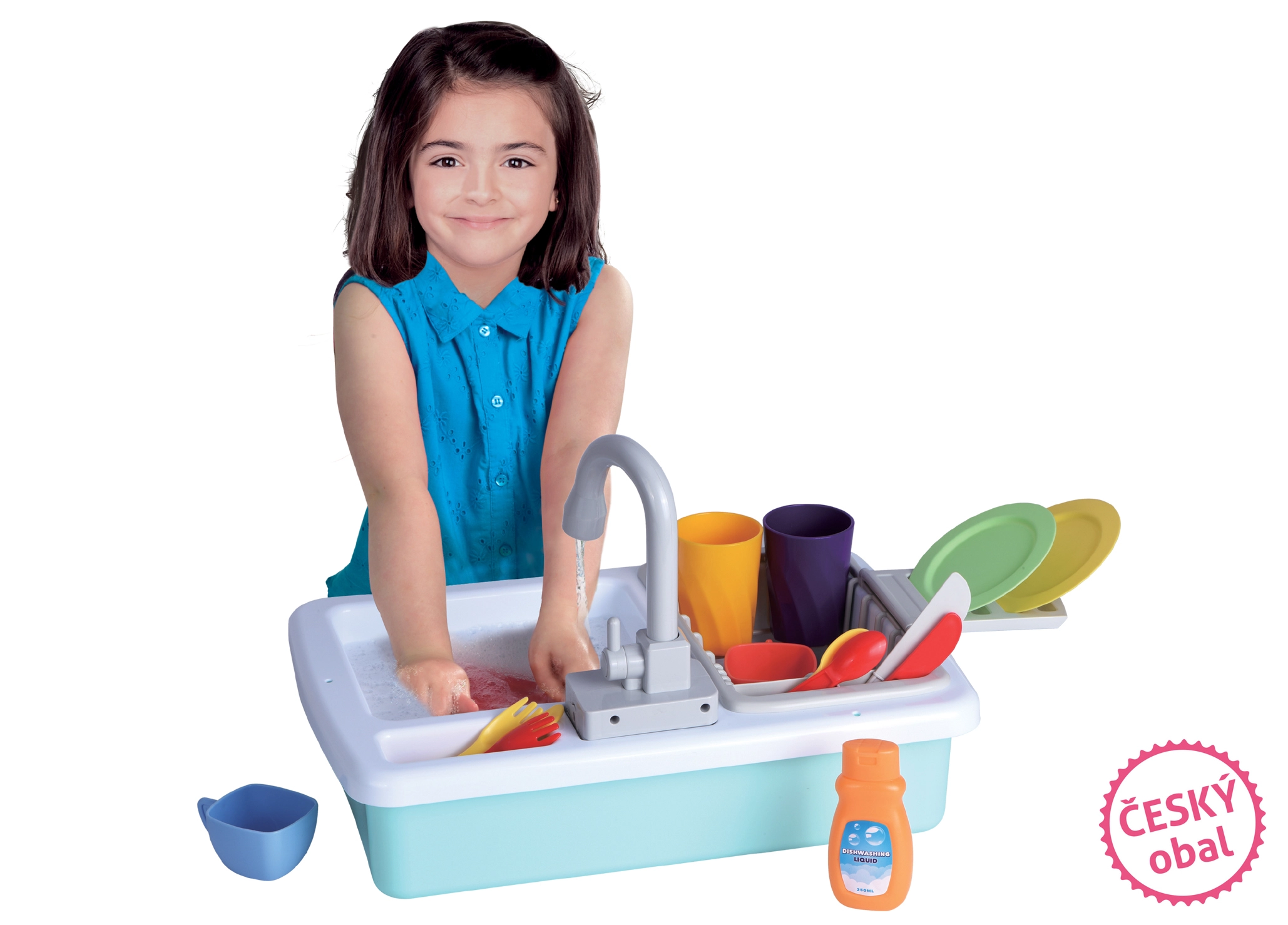Pakken indeholder praktisk køkkentilbehør, så børnene kan begynde med det samme: krus, tallerkener, kopper, bestik samt opvaskemiddel for en endnu mere realistisk leg. Vasken er et fantastisk supplement til ethvert børnekøkken og underholder i timevis.
