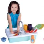 Pakken indeholder et farverigt sæt til en komplet opvaskeplads. Fyld blot beholderen med vand, indsæt batterier, og legen kan begynde.