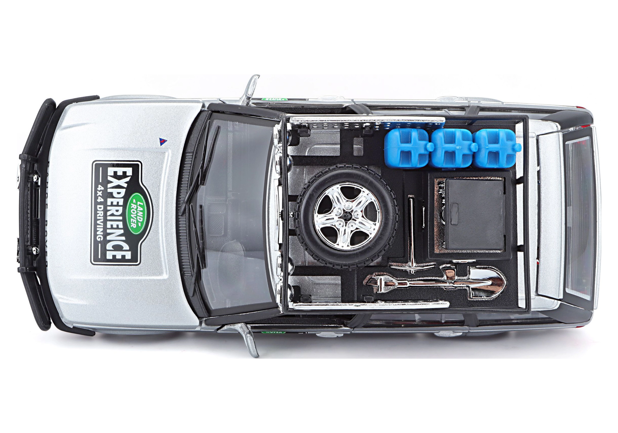 Modellen prydes af en tagbærer med tilbehør – dunke, reservehjul, værktøj og ekstra lygter for et eventyrlystent look.
