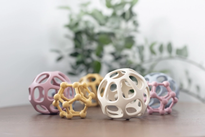 Bideringen er fremstillet af sikker fødevaregodkendt silikone, som er ugiftig og brudsikker. For små børn føles silikone mere naturligt end plast eller metal. Designet som en åben kugle passer perfekt selv til den mindste hånd og gør det let for barnet at gribe fra enhver vinkel. Takket være udformningen stimulerer bideringen håndmotorikken, især hånd-øje-koordinationen.