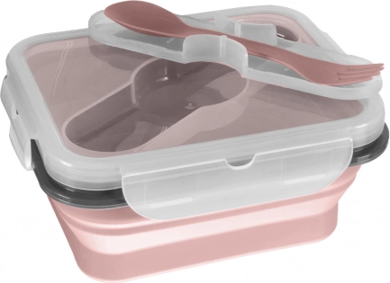 Denne madkasse er lavet af sikker fødevaregodkendt silikone, som er ikke-giftig og brudsikker. En stor fordel er, at den let kan foldes sammen, så den reducerer sin størrelse med op til 60 %, hvilket gør den til en ideel ledsager på ture. Låget slutter meget tæt, og har et indbygget rum til bestik; ske og gaffel medfølger i et praktisk etui.
