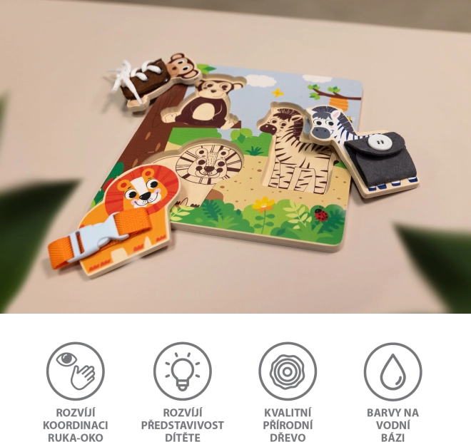 Dette kvalitetsrige træ-Montessori-puslespil bringer børn ind i en farverig safariverden med populære dyr som løve, zebra og abe. Hver brik tilbyder en ny opgave – spænde et spænde, binde et snørebånd eller knappe en knap – så børn naturligt træner selvstændighed og tålmodighed.