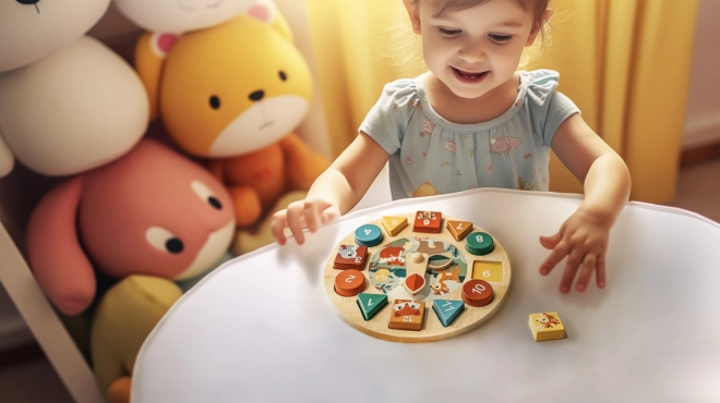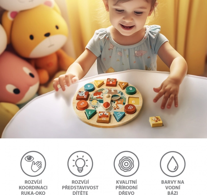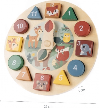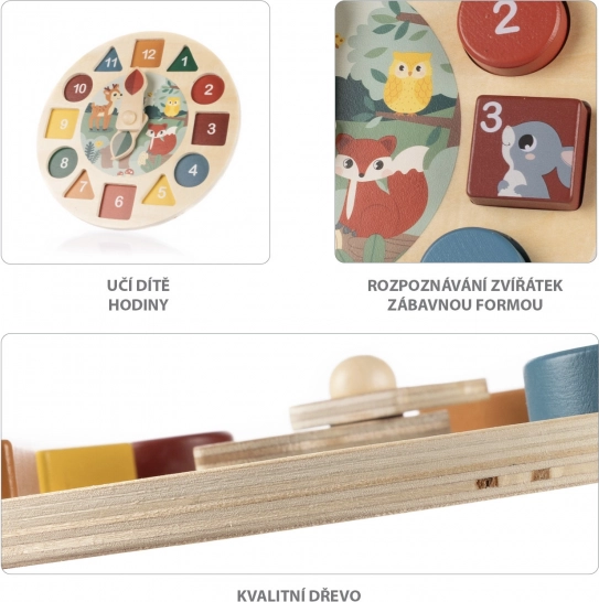 Det træske aktivitetsur tilbyder masser af sjov læring. Barnet lærer helt naturligt gennem leg. Dette træaktivitetsur tilbyder flere læringsområder, herunder tal fra 1 til 12, dyr, former, farver og klokken. Det støtter udviklingen af finmotorik, logisk tænkning og fantasi.