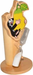 Træstativ til tandbørste med det elskede motiv af Mulvarpen og hans venner, som gør tandbørstning sjovere for børn med timeglas.