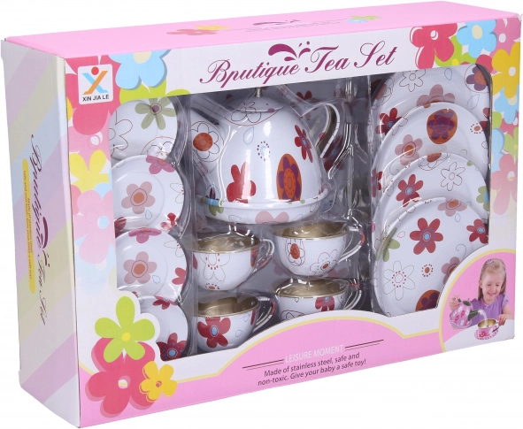 Metaltiesæt til børn med tekande, kopper, underkopper og tallerkener. Holdbart materiale, sødt design, ideelt til børn fra 3 år. Perfekt til leg og picnic.