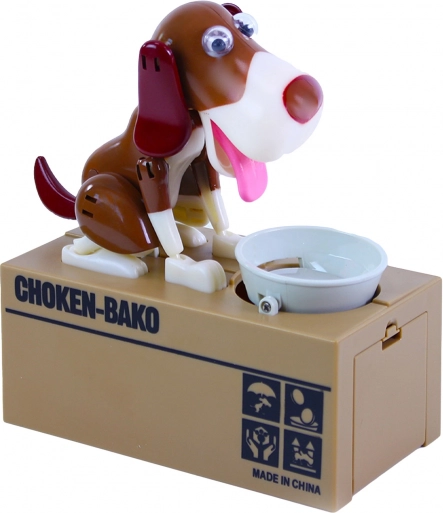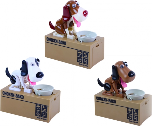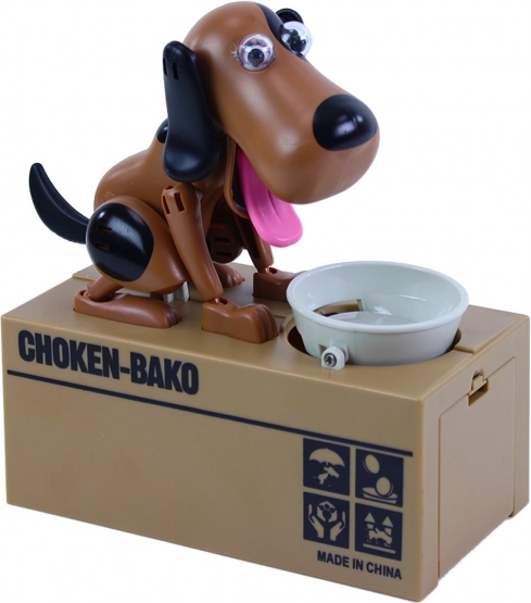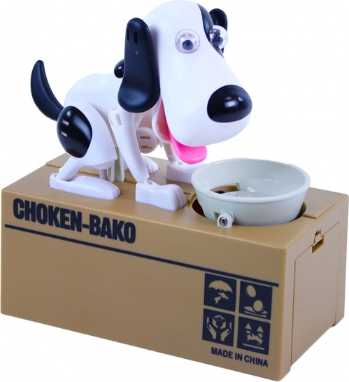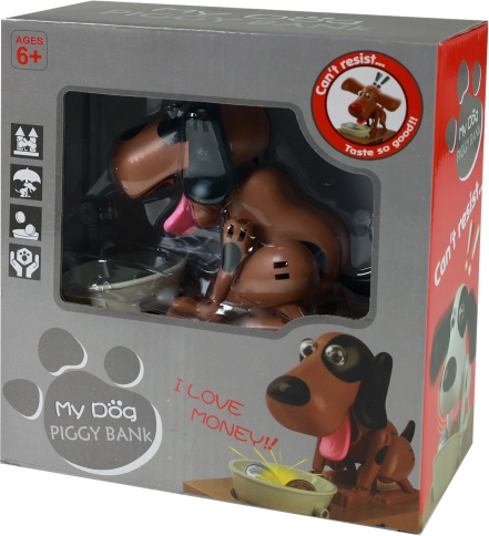 Sparegrisen tilbyder en underholdende måde at spare op på. Læg en mønt i skålen, og se, hvordan hunden spiser den og gemmer den inde i sparegrisen.