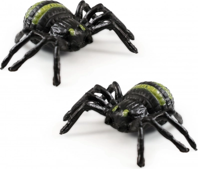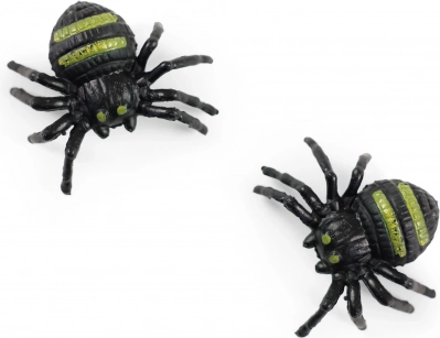 - 2 plastik-edderkopper med sorte kroppe og grønne striber, som realistisk efterligner edderkopper.