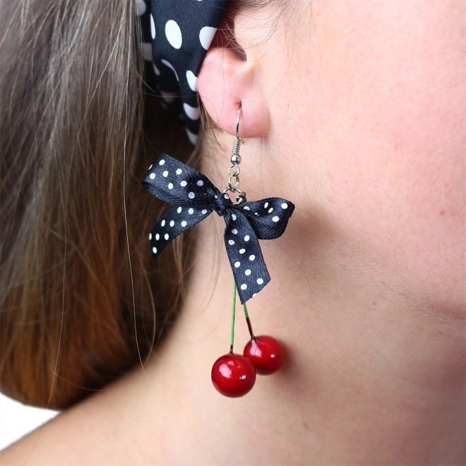 - Øreringe: Stilfulde øreringe i form af kirsebær med prikket sort bånd bringer et unikt og legende element til ethvert outfit.