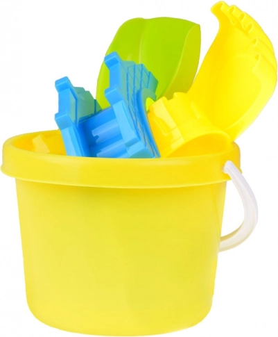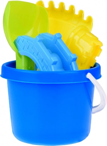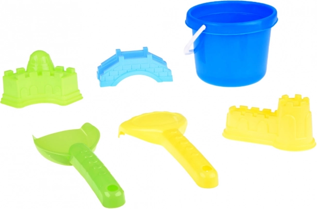 Alt, hvad børn behøver for at bygge slotte og broer: spand, skovl, rive og 3 forme i klare farver. Fremmer kreativ leg og samarbejde.