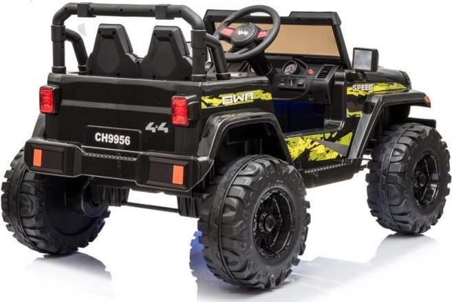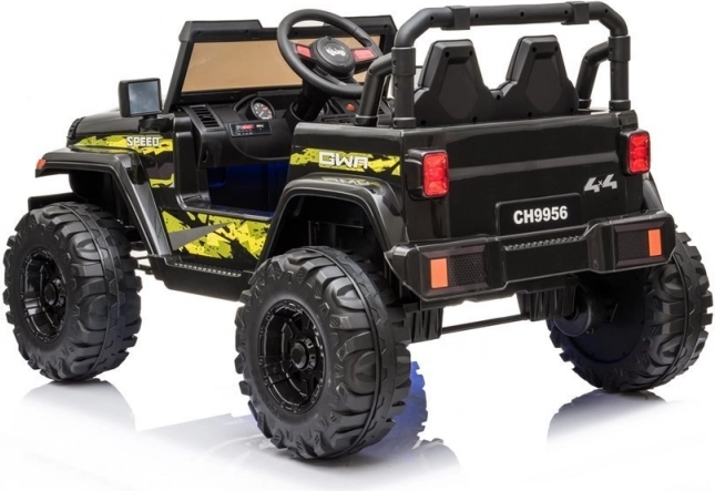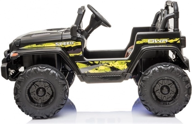 Denne sorte elektriske børnebil i offroad-stil er designet til sikker og sjov kørsel. Store terrænhjul, åben karrosseri og realistiske detaljer som lys, spejle og beskyttelsesbøjle skaber en autentisk køreoplevelse. Sporty dekorer og LED-elementer giver bilen et attraktivt look.