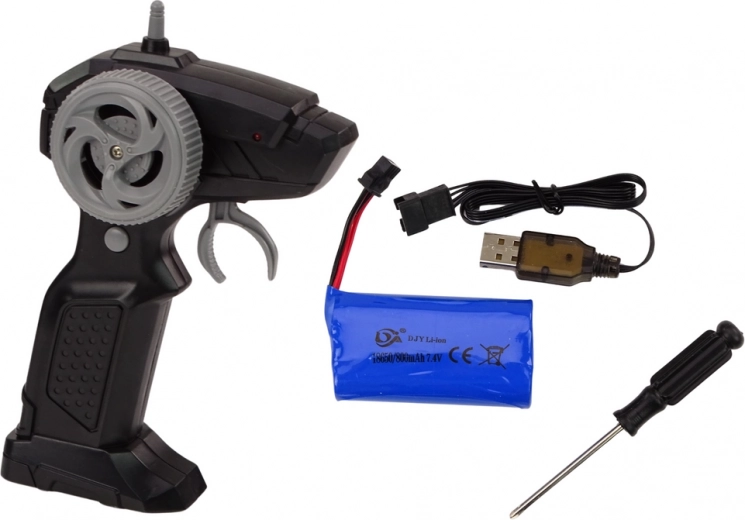 Bilen drives af et 3,7V 50mAh batteri, som er inkluderet i sættet. En oplader medfølger batteriet.