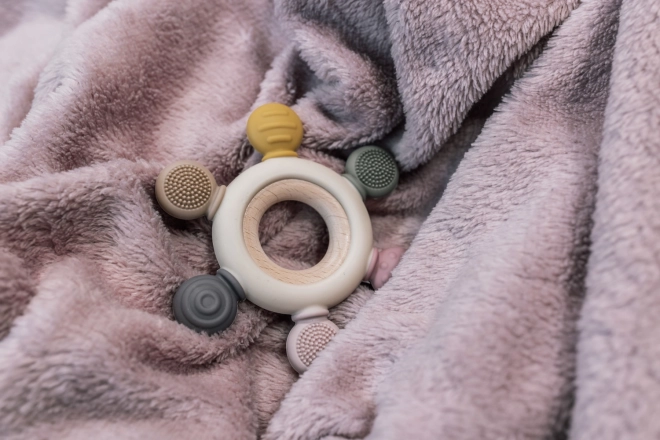 De forskellige farverige teksturer på bidelegetøjet hjælper med at berolige irriterede gummer og giver barnet underholdning.