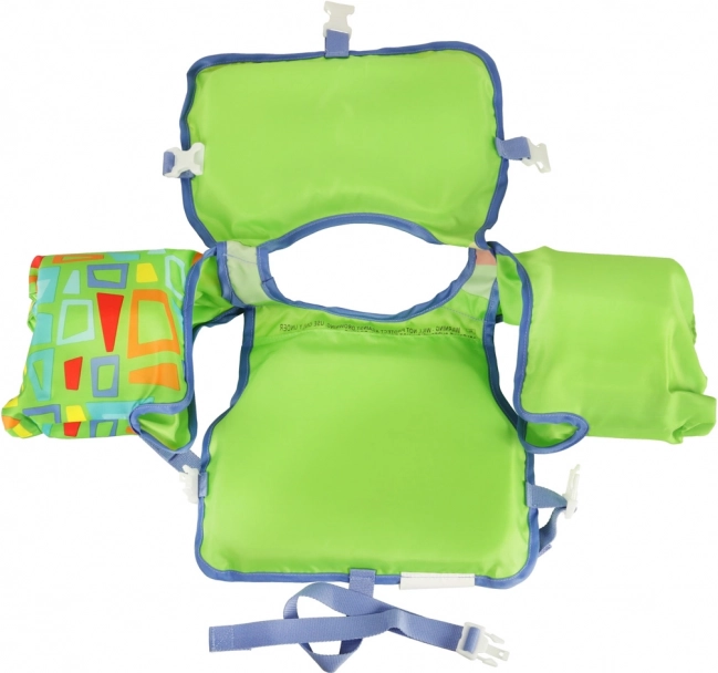 Skumfyld i vesten sikrer stor opdriftsstyrke, mens tilsluttede ærmer syet i blødt materiale holder barnet uden problemer på overfladen. Justerbare spænder sikrer perfekt tilpasning til barnets krop, hvilket giver komfort under leg. Vesten har et markant, grønt design og et interessant mønster, der tiltrækker opmærksomhed, og barnet er synlig selv på afstand.