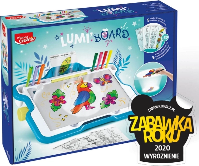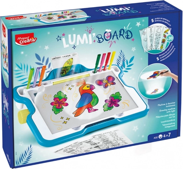 Den oplyste tegneplade fra Maped er skabt til små kunstnere, der vil forbedre deres færdigheder og samtidig have det sjovt. Tænd lyset, læg en skabelon under skærmen, og placer et rent stykke papir ovenpå. Derefter kan børnene begynde deres kunstneriske skaben.