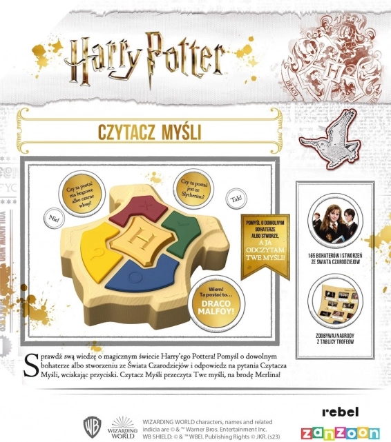 En sand lækkerbisken for alle Harry Potter-fans, der vil teste deres viden om den elskede historie og mærke lidt magi på egen krop! Tænk på en hvilken som helst figur eller skabning fra den unge troldmands verden, og lad tankelæseren gætte dit valg! Denne magiske enhed stiller dig nogle spørgsmål, som du besvarer ved at trykke på bestemte knapper. På den måde finder I sammen frem til, hvilken figur det er.