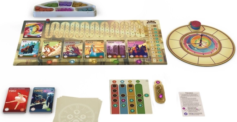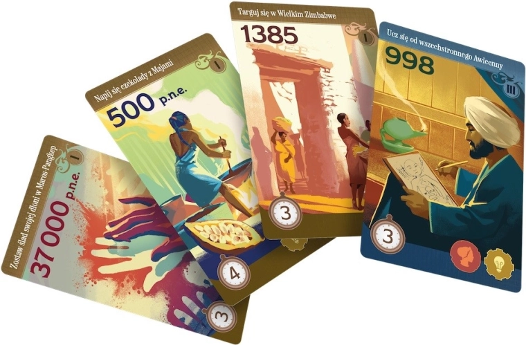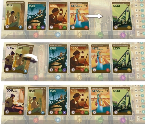 På spillebrættet venter der begivenhedskort, som du kan rykke til. I spillet er tiden valutaen, markeret på et særligt ur, og prisen på et kort afhænger af dets placering. Hvis du virkelig går efter et bestemt kort, kan du rykke længere frem på uret, men husk, at uret også bestemmer turordenen. I dette spil spiller vi ikke skiftevis; den aktive spiller er den, der står længst tilbage på uret. Et tilsyneladende ekstremt fordelagtigt træk kan vise sig mindre attraktivt, når man tænker på, at modstanderne måske får to ture hver, før de indhenter os.