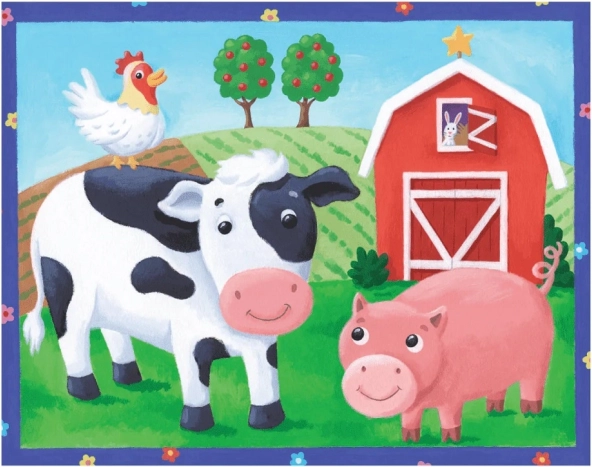 Opdag dyrenes verden på gården – ko, gris og hane vil glæde små byggere, mens en kanin kigger frem fra den røde lade. Baggrunden med bakke og æbletræer stimulerer fantasien og historieskabelsen. Puslespillet er designet til små børnehænder, brikkerne er ekstra tykke og lette at samle.