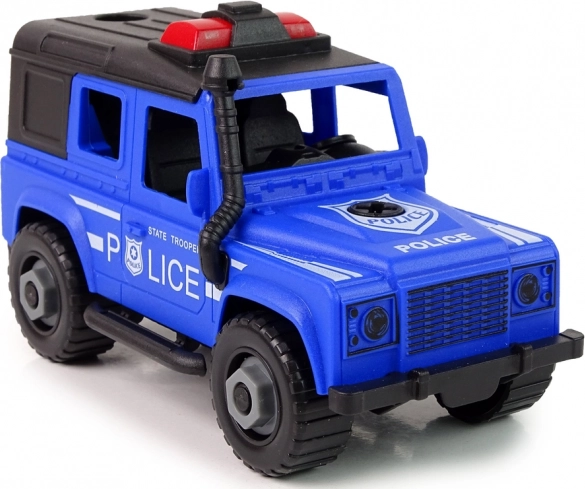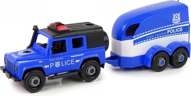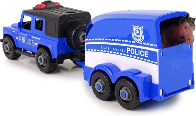 Sættet er ideelt til små fans af politiaktioner. Den terrængående bil trækker sikkert hestetraileren, som har en åbnbar bagklap for nem på- og aflæsning. Takket være skruerne og den medfølgende skruetrækker kan bilen skilles ad og samles, hvilket udvikler færdigheder og lærer teknisk tænkning på en sjov måde.