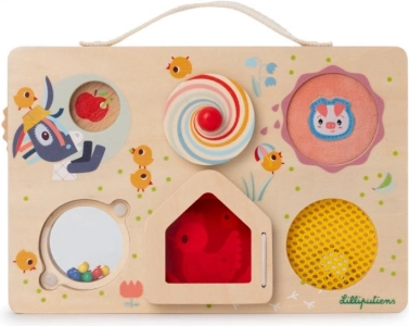 Træpanel med aktiviteter fra Lilliputiens tilbyder mange interaktive elementer for børn, som støtter udviklingen af finmotorik og sanser, hvad enten det er ved at dreje, trykke, trække eller observere.