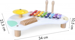 Bordet er lavet af kvalitetstræ og metal og har sikre afrundede kanter. Det attraktive, farverige design understøtter den visuelle perception og motiverer til selvstændig leg. Perfekt som første musik-sæt, der styrker hørelse, rytme og kreativitet.