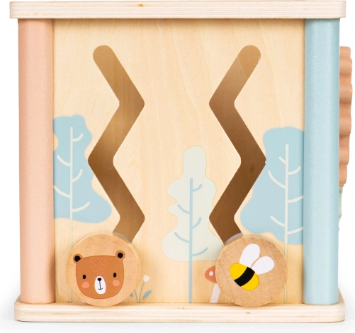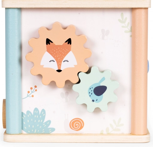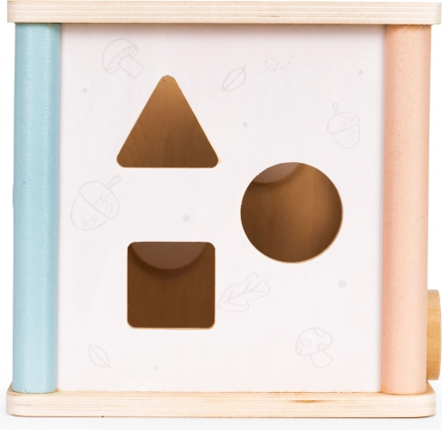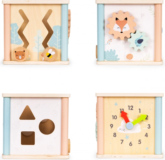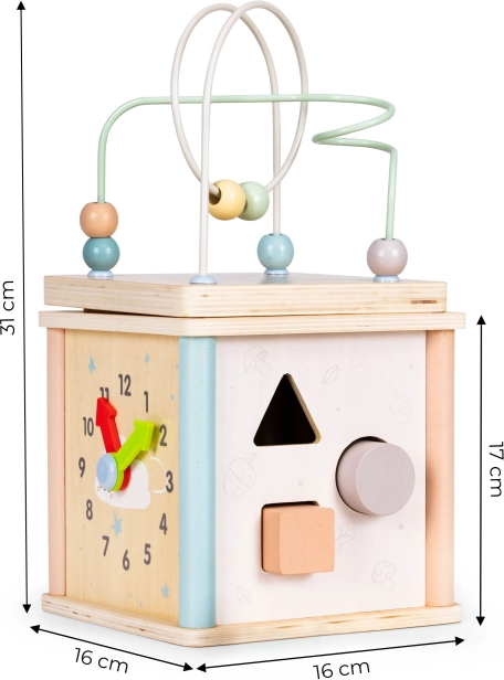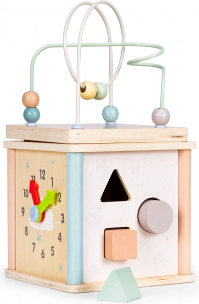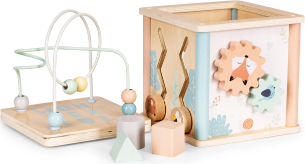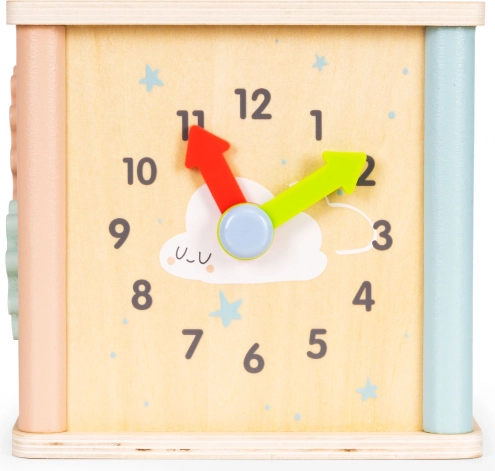 Multifunktionel træ-aktivitetskube fra ECOTOYS giver børn både leg og læring i ét. Den byder på kuglebane/labyrint, dreiende tandhjul, ur med bevægelige visere og formsorterer med farvede klodser. Den fremmer finmotorik, øje–hånd-koordination, farve- og formgenkendelse og understøtter selvstændig leg. Sikker udførelse og behagelige pastelfarver glæder både børn og forældre.