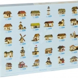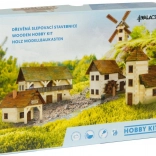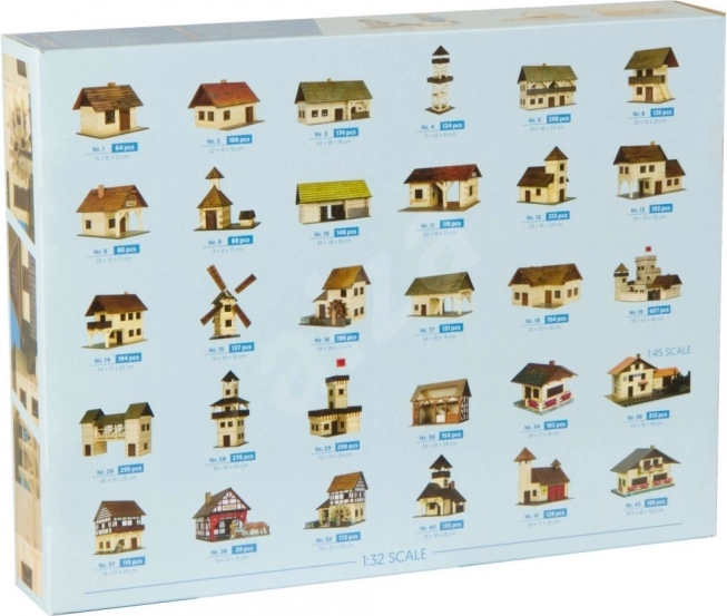 - Pakken indeholder: trælister i angivne længder, dele til tage og gavle, kartonudskæringer til vinduer og døre, fortrykte papirdekorer, skematisk samleplan.
