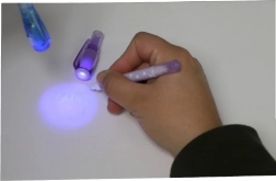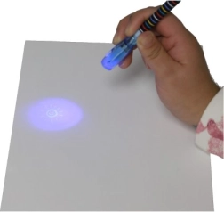 Usynligt blæk, der kun er synligt under UV-lampen i pennens hætte. Perfekt til hemmelige beskeder og spionlege.