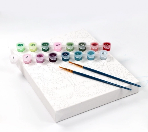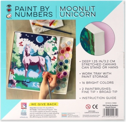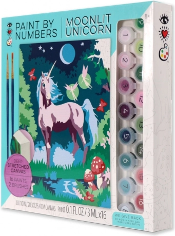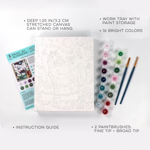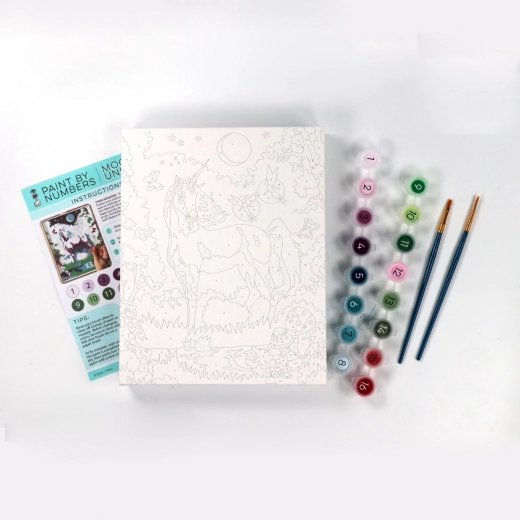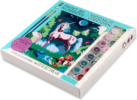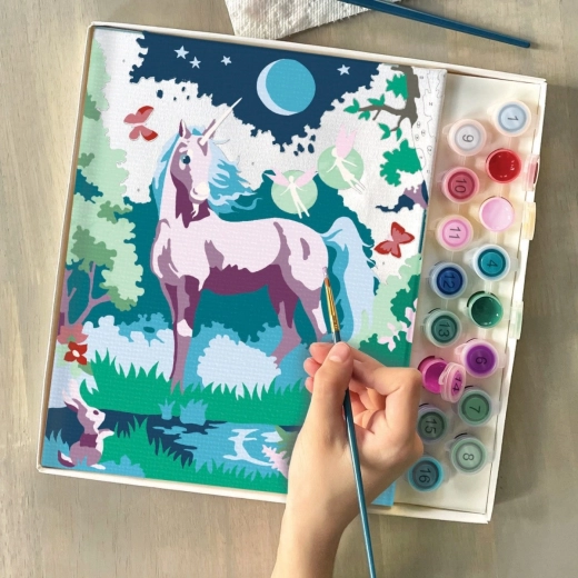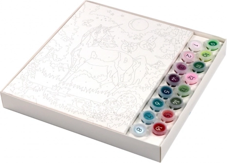 Oplev afslapning og kreativitet med sættet maling efter tal – enhjørning. Ideelt til både begyndere og øvede: påfør blot den rigtige farve på de nummererede felter, og skab nemt dit eget billede med et magisk enhjørninge-motiv.