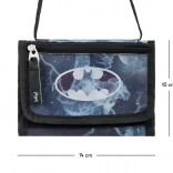 Pungen har et blå-sort motiv med røg- og natmønstre, perfekt suppleret af Batmans symbol.